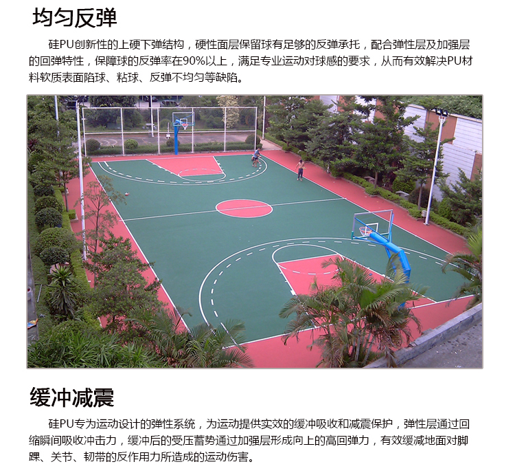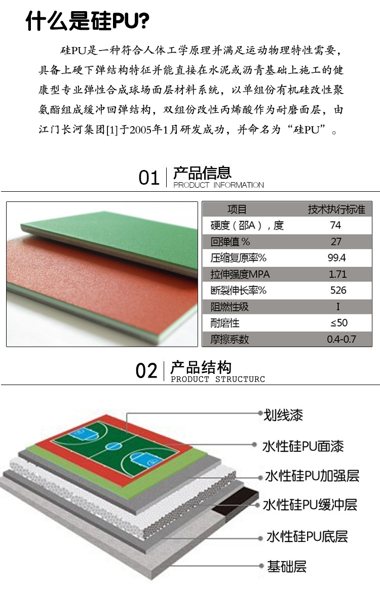 硅PU是一种符合人体工学原理并满足运动物理特性需要,具备上硬下弹结构特征并能直接在水泥或沥青基础上施工的健康型专业弹性合成球场面层材料系统,以单组份有机硅改性聚氨酯组成缓冲回弹结构,双组份改性丙烯酸作为耐磨面层